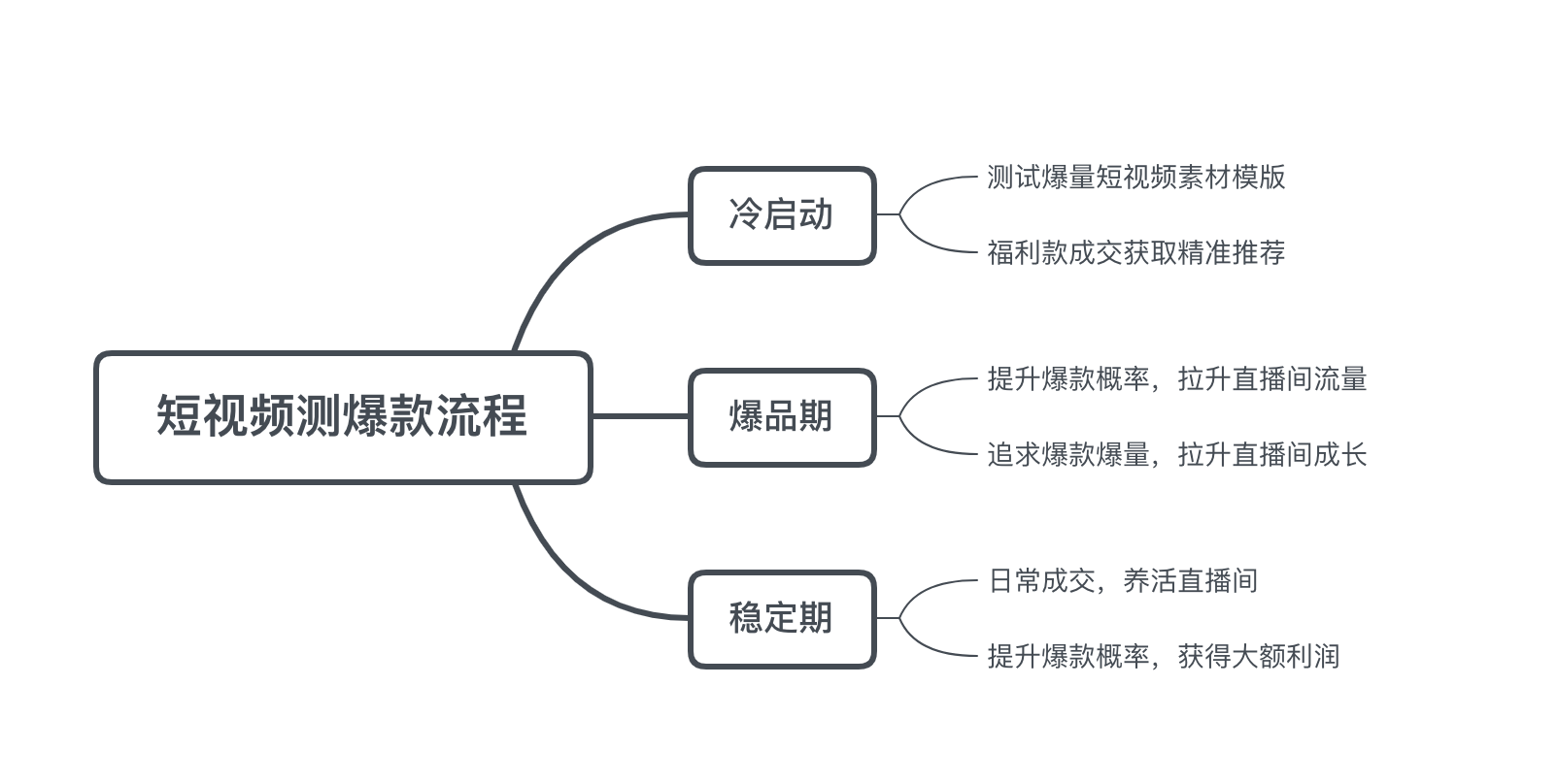 冷啟動期,品牌主測試出爆量短視頻素材模版后,就可以借此提高帳號整體短視頻內(nèi)容的爆量。接下來,通過推動福利款的成交獲得直播間精準流量,拉動自然推薦。