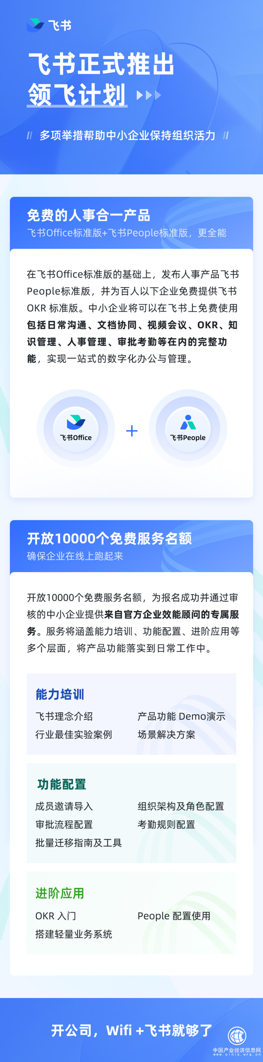 5月25日,飛書舉行春季未來無限大會,飛書首席商業(yè)官林嬋宣布推出“領(lǐng)飛計劃”。該計劃包含了一攬子中小企業(yè)扶持方案,飛書將為中小企業(yè)免費提供“人事合一”的飛書Office標準版與飛書People標準版。同時,飛書還將為中小企業(yè)提供一萬個免費企業(yè)效能顧問服務名額,幫助企業(yè)落地更好的數(shù)字化辦公方案,從產(chǎn)品和服務兩個維度全面助力中小企業(yè)應對挑戰(zhàn)。