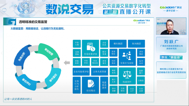 根據(jù)王叢虎教授拋出的公共資源交易監(jiān)管優(yōu)化思路,劉躍廣從技術(shù)和應(yīng)用層面進(jìn)行了補(bǔ)充,講解了數(shù)字化轉(zhuǎn)型如何推動(dòng)公共資源實(shí)現(xiàn)透明精準(zhǔn)的交易監(jiān)管。