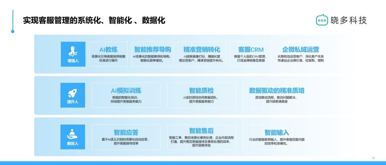 從整個客服團隊的能力模型上來說,從大面上分成服務(wù)能力、專業(yè)知識和營銷能力三類。那如何讓一兩百人的客戶團隊,從三個方面都能有效提升,并且成本還能得到有效控制呢?這個就需要我們AI的能力了。曉多AI從解放人、提升人和增強人這三個方面去賦能我們的客服體系,為我們的商家?guī)硐鄳?yīng)的價值。