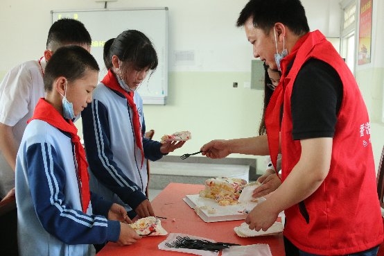 (圖為志愿者與孩子們分享節(jié)日蛋糕李夢(mèng)怡攝)
