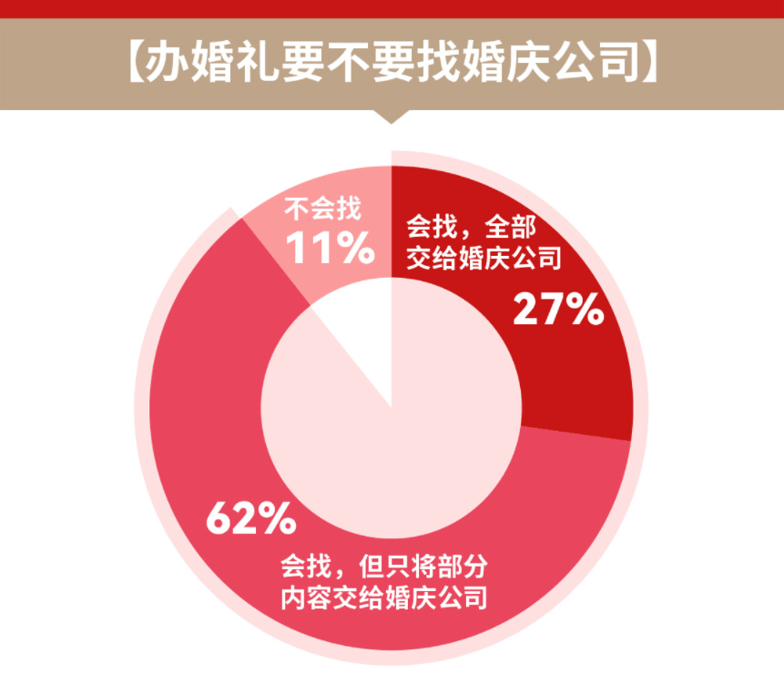 如今,新人們要舉辦婚禮就避免不了考慮要不要找婚慶公司,因?yàn)榛槎Y涉及到風(fēng)格選擇、流程籌備、攝影預(yù)約、搭建風(fēng)格、婚紗攝影等事項(xiàng),而大多數(shù)新人們沒有足夠的經(jīng)驗(yàn)應(yīng)對(duì)籌備婚禮中出現(xiàn)的問題,所以婚慶公司應(yīng)運(yùn)而生,尤其是專業(yè)化的婚慶公司愈發(fā)受到適婚人群的青睞。調(diào)查顯示,近九成適婚人群表示如果籌辦婚禮會(huì)選擇婚慶公司,所以大部分婚禮現(xiàn)場(chǎng)都能看到婚慶公司工作人員的身影。婚禮堂,作為近年來開始流行起來的一站式婚禮服務(wù)模式,其省時(shí)省心省力、價(jià)格友好的特點(diǎn)也逐步成為適婚人群的一個(gè)不錯(cuò)的選擇,是當(dāng)今性價(jià)比較高的婚禮服務(wù)模式,受到半數(shù)左右知曉一站式婚禮服務(wù)模式的男女青睞。