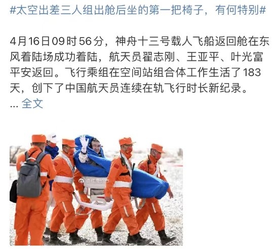 內(nèi)容包括“神舟十三號返回艙在京開艙”、“直擊神舟十三號航天員乘組抵京”、“神舟十三號創(chuàng)造了哪些史上第一”等。其中一條“太空出差三人組出艙后坐的第一把椅子,有何特別”更是沖上了熱搜,引起了廣大網(wǎng)友的強烈關(guān)注,一夜之間,這把椅子火遍全網(wǎng)。甚至火爆到了消費市場,網(wǎng)友們?nèi)W(wǎng)搜索哪里有賣的,紛紛表示想要get航天員同款椅子。