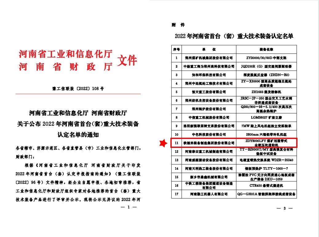 近期,河南省工業(yè)和信息化廳發(fā)布:關于公布2022年河南省首臺(套)重大技術裝備認定名單,鐵福來集團研發(fā)的“ZDY8000LFY煤礦用履帶式全液壓坑道鉆機”榮獲2022年河南省首臺(套)重大技術裝備。