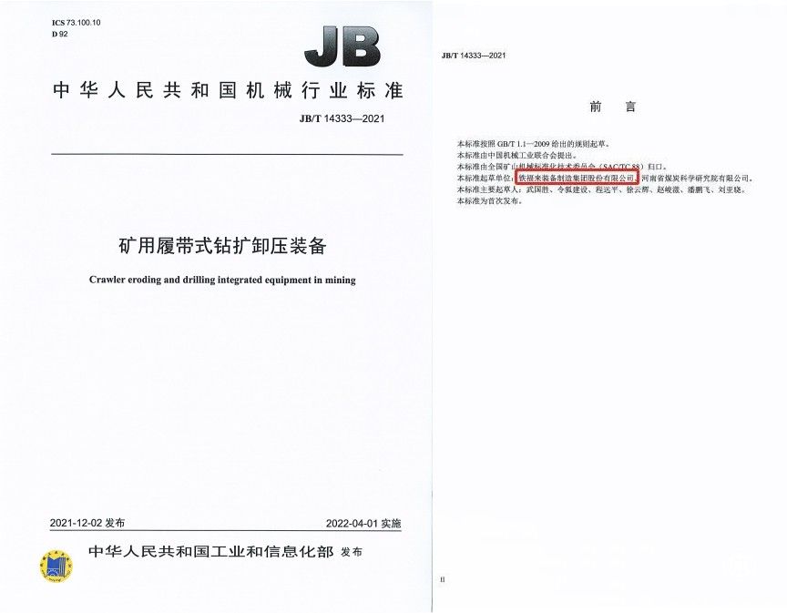 鐵福來集團制定的“中華人民共和國機械行業(yè)標準JB/T14333-2021礦用履帶式鉆擴卸壓裝備”正式上線發(fā)售。該標準由國家工業(yè)和信息化部發(fā)布,于2022年4月1日正式實施,該標準的制定充分彰顯了鐵福來集團在煤礦防突鉆探領域技術及裝備實力。