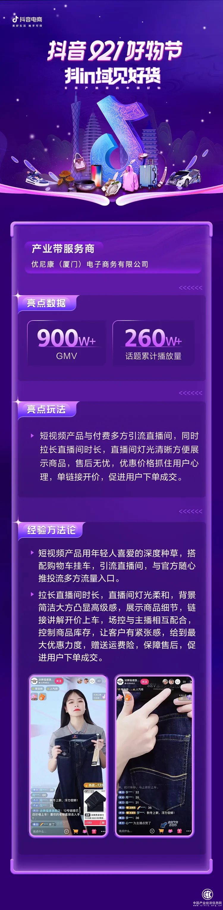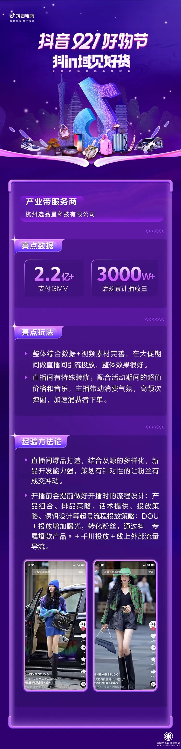 據(jù)統(tǒng)計,921好物節(jié)「抖in域見好貨」期間,中小商家泛商城生意、產(chǎn)業(yè)帶服務(wù)商總生意、品牌服務(wù)商生意均得到新發(fā)展,產(chǎn)地名片話題總播放量突破億,吸引海量用戶圍觀。義烏商城好貨產(chǎn)業(yè)帶、海寧皮草產(chǎn)業(yè)帶、嘉興秋冬服飾產(chǎn)業(yè)帶、杭派女裝產(chǎn)業(yè)帶、廣東潮流女裝等產(chǎn)業(yè)帶生意數(shù)據(jù)亮眼,織里童裝則憑借破億播放量贏得全網(wǎng)關(guān)注。