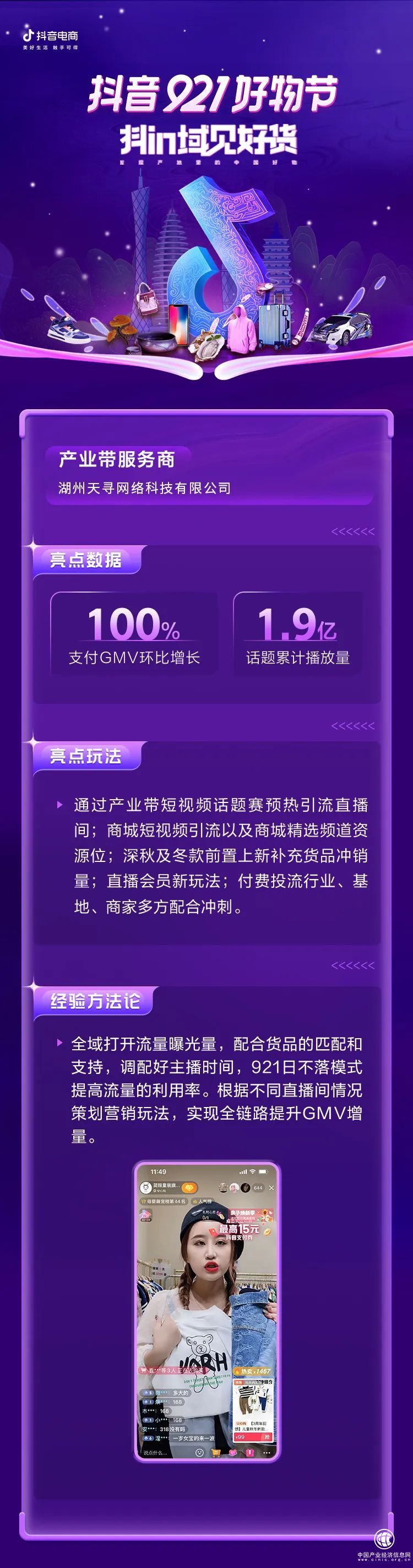 「湖州天尋網(wǎng)絡(luò)科技有限公司」幫助織里童裝成功實現(xiàn)1.9億話題播放量,支付GMV直接翻倍,其方法論在于:通過短視頻話題賽預熱引流直播間,加強商城短視頻引流以及商城精選頻道資源位曝光,幫助產(chǎn)業(yè)帶商家實現(xiàn)“全域打開流量”。