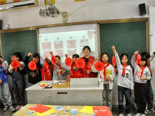 圖為:志愿者與同學(xué)們一起展示紅色手工作品(巫曉俊 攝)