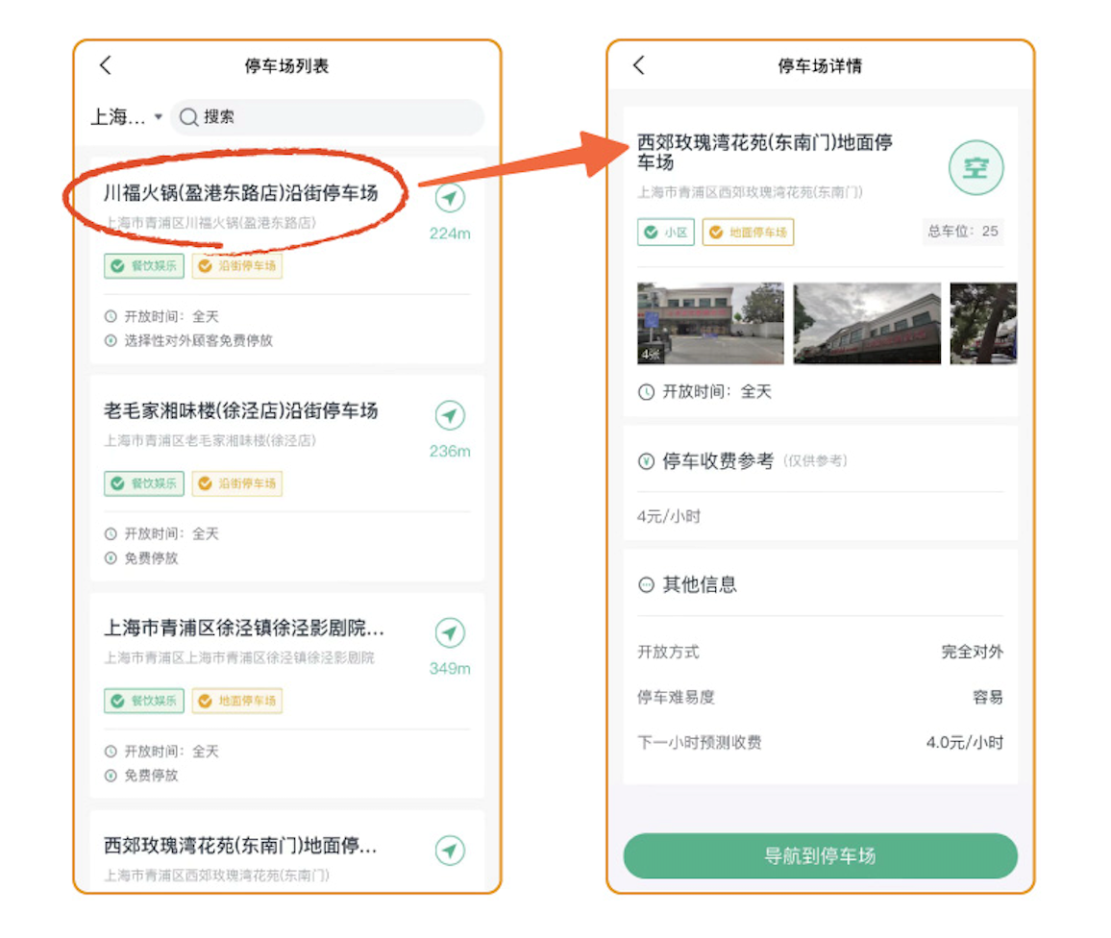 Step2:點(diǎn)擊任一停車場,可查看該停車場詳情;詳情可查看開放時(shí)間段、收費(fèi)參考、車位空閑情況等信息;