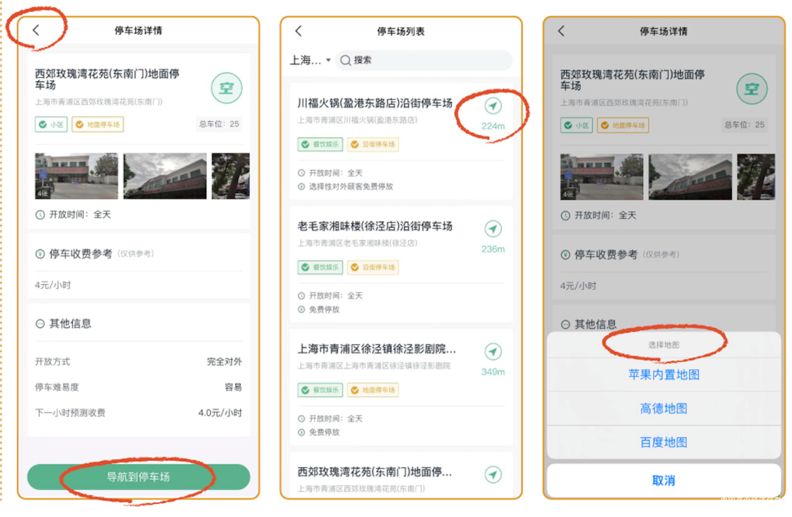 Step3:確定選擇的停車場后可在“停車場詳情”頁點(diǎn)擊下方“導(dǎo)航到停車場”/點(diǎn)擊按鈕“<”返回停車場列表頁,點(diǎn)擊導(dǎo)航符號(hào),選擇地圖后直接開啟導(dǎo)航,開往停車場;