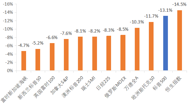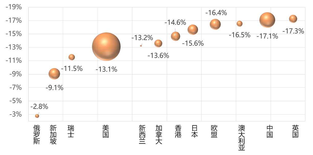 注:圖中球的面積代表各個權益市場的規(guī)模,美元化權益資產收益率 = (1+美元匯兌收益率)*(1+本幣權益收益率)-1,各個國家和地區(qū)選擇代表性股指分別為:俄羅斯MOEX、富時新加坡海峽指數(shù)、瑞士SMI、標普500指數(shù)、新西蘭標普50、加拿大S&P、恒生指數(shù)、日經(jīng)225、歐洲斯托克50指數(shù)、澳洲標普200、萬德全A、英國富時100。