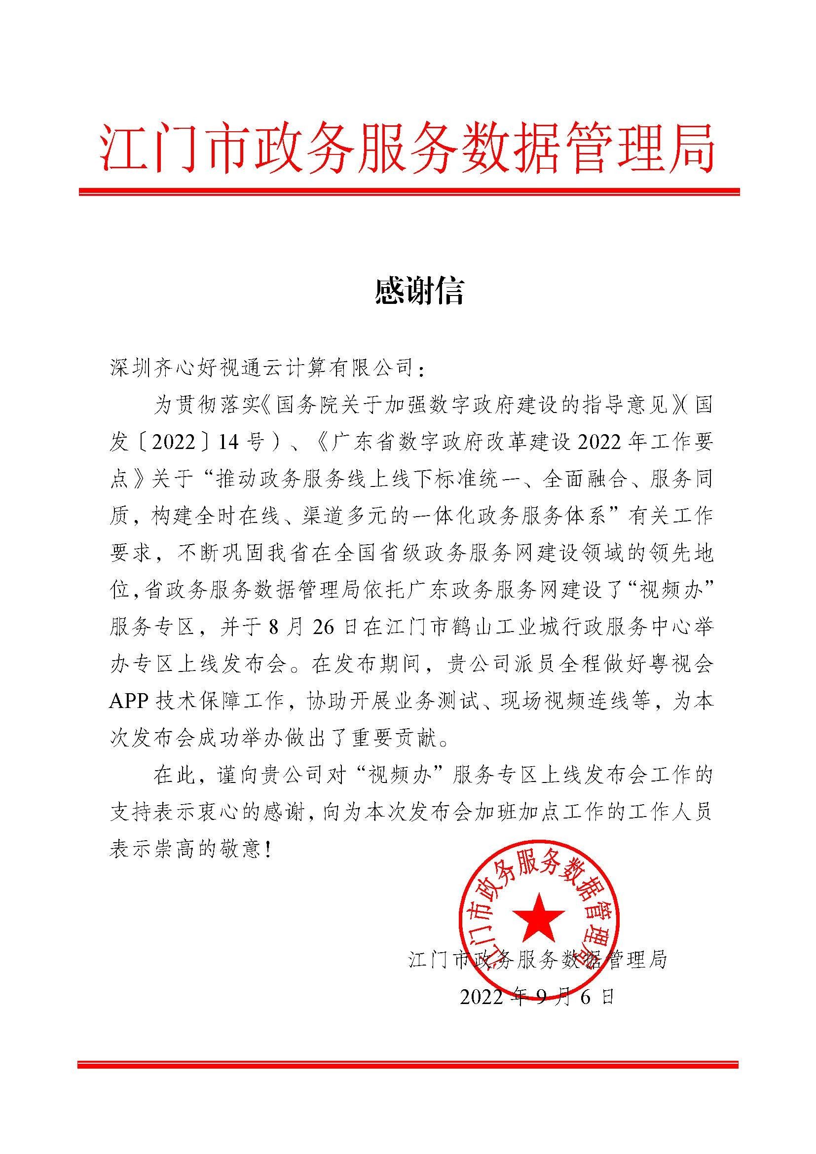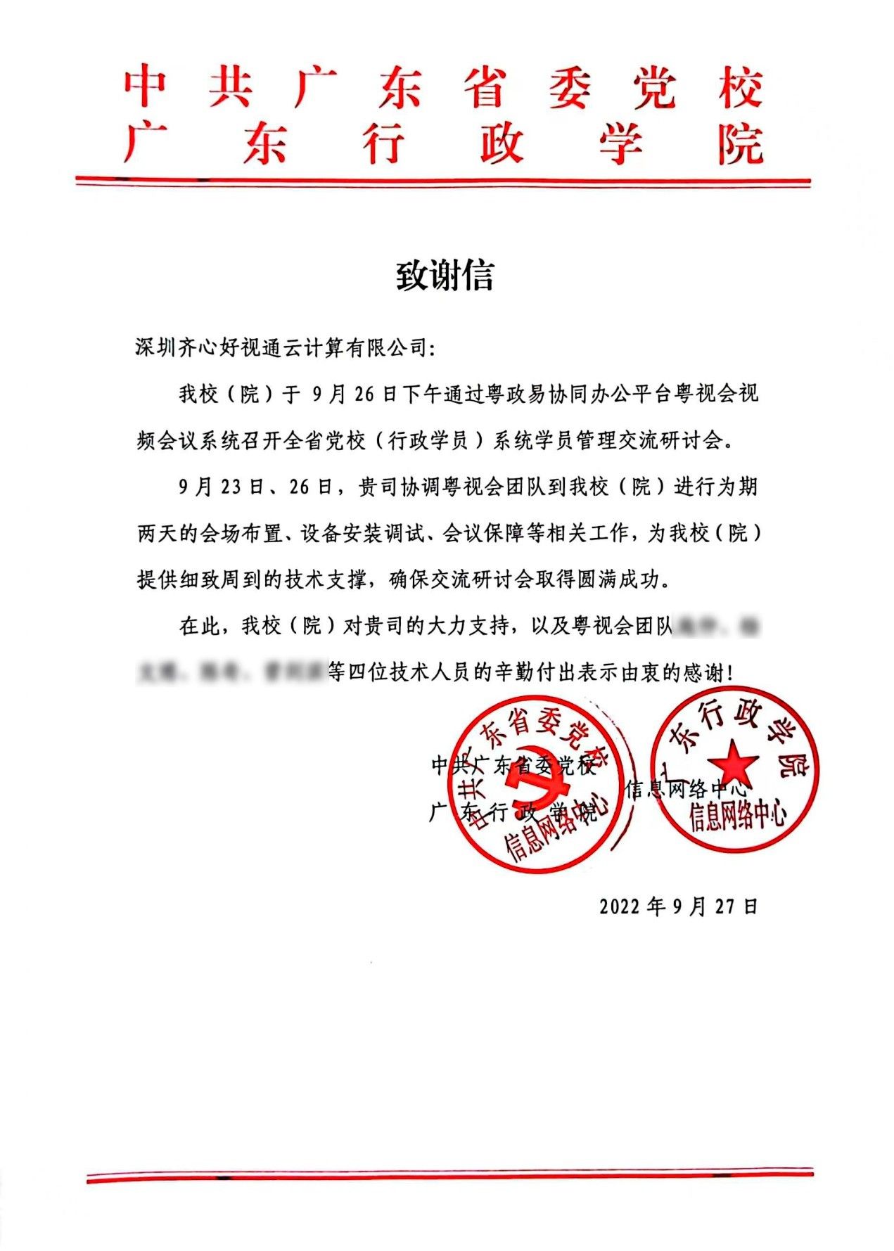 感謝信分別來自中共廣東省委黨校(廣東行政學(xué)院)、中共惠州市委黨校、廣東省政務(wù)服務(wù)數(shù)據(jù)管理局及江門市政務(wù)服務(wù)數(shù)據(jù)管理局,信中對(duì)好視通專業(yè)細(xì)致的支持保障、高清流暢的云視頻會(huì)議體驗(yàn)、豐富的產(chǎn)品應(yīng)用給予了充分肯定與認(rèn)可。