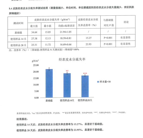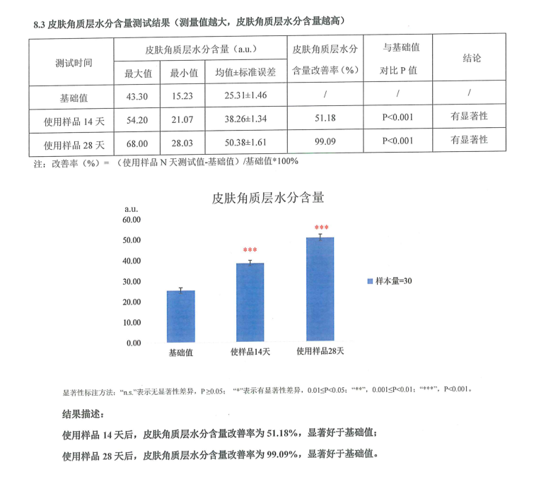 經(jīng)委托權(quán)威機構(gòu)檢測后,可以證明我們在使用潤顏修護凍干精華液14天后,皮膚角質(zhì)層含水量改善率為51.18%,28天后,皮膚角質(zhì)層含水量改善率為99.09%,顯著好于基礎(chǔ)值,補水效果顯而易見!