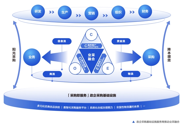 白皮書提出基于采購基礎(chǔ)設(shè)施服務(wù)商的 “OEC” 價(jià)值模型,助力政企客戶實(shí)現(xiàn)業(yè)務(wù)與采購雙向融通、深度融合,推進(jìn)政企采購信息流、商流、物流和資金流 “四流合一”,實(shí)現(xiàn)采購與研發(fā)、生產(chǎn)、營銷、組織、財(cái)務(wù)的“五大融合”。