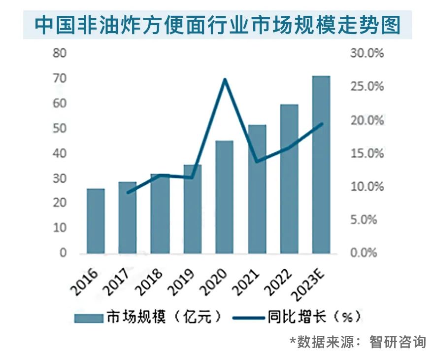 最近這些年,健康化成為了大眾飲食的一大趨勢(shì)。在這一趨勢(shì)下,“非油炸方便面”成為新一輪風(fēng)口。據(jù)智研咨詢報(bào)告數(shù)據(jù)顯示,非油炸方便面在過(guò)去幾年的市場(chǎng)規(guī)模增速超過(guò)了10%,預(yù)計(jì)未來(lái)將繼續(xù)維持在這一增速水平,成為方便面行業(yè)中的“新藍(lán)?!?。