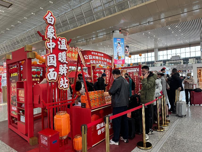 繼2024年春運期間在全國近30個車站設立 “白象中國面溫暖驛站”(下稱“溫暖驛站”)服務返鄉(xiāng)群體后,今年春運伊始,白象食品又在成都東、漢口、南京南、長沙南等全國多個人流量較大的火車站及石家莊、新鄉(xiāng)等地的汽車站設溫暖驛站,除免費發(fā)放方便面外,還提供熱水、口罩、紙巾、充電寶、創(chuàng)可貼、溫度計等應急物品,部分驛站還有現(xiàn)場寄新年明信片、送福字、贈春聯(lián)等新春互動活動。