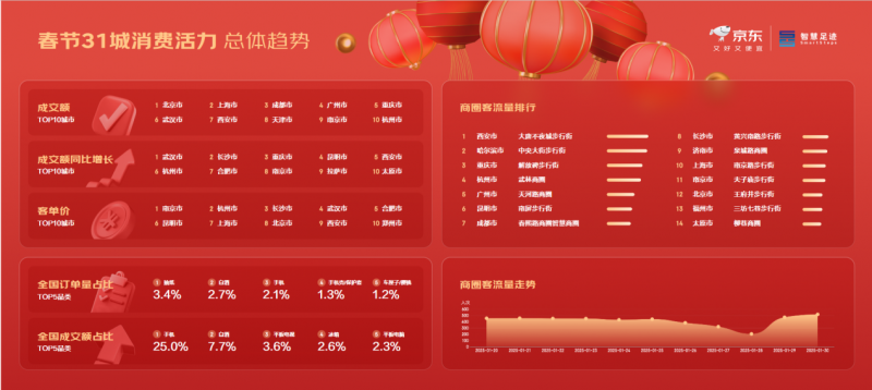 乙巳年春節(jié)假期,消費(fèi)市場(chǎng)持續(xù)火熱,線下商圈通過特色場(chǎng)景化消費(fèi)、生活?yuàn)蕵废M(fèi)以及文化體驗(yàn)消費(fèi),吸引了大量消費(fèi)者,展現(xiàn)了春節(jié)消費(fèi)的多樣性與活力。京東聯(lián)合聯(lián)通數(shù)智智慧足跡,對(duì)全國(guó)31個(gè)城市的線下商圈客流量及消費(fèi)數(shù)據(jù)進(jìn)行了實(shí)時(shí)動(dòng)態(tài)統(tǒng)計(jì),反映出消費(fèi)者在春節(jié)線上線下各場(chǎng)景中的消費(fèi)趨勢(shì)。