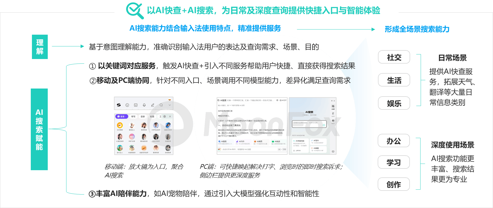 頭部輸入法產(chǎn)品在AI搜索方面投入較多,其中搜狗輸入法在各方面均占據(jù)優(yōu)勢,移動端和PC均設(shè)置最便捷AI搜索入口,同時關(guān)注多場景、個性化功能,從搜索開始到具體場景應(yīng)用均有覆蓋,產(chǎn)品具備新型工具和助手型產(chǎn)品雙重優(yōu)勢。