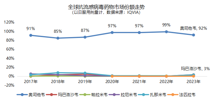 2023年全球抗流感藥物市場,奧司他韋使用量占比超90%。