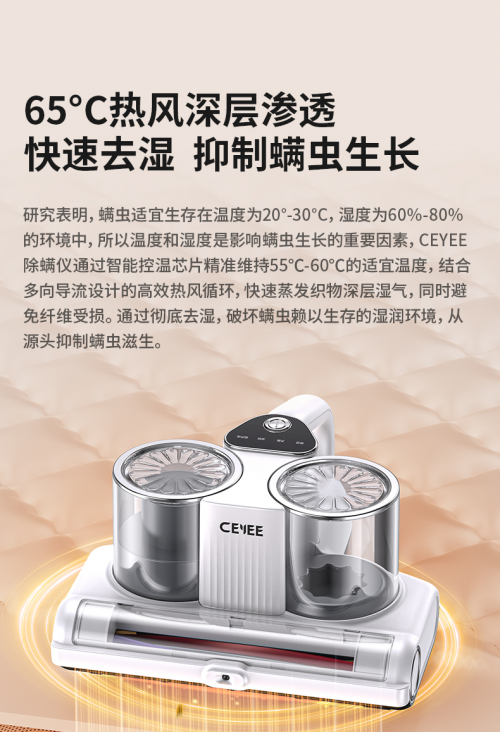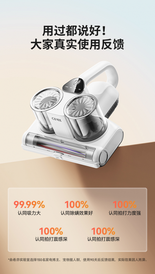 除了拍打和吸力方面的卓越表現(xiàn)外,希亦除螨儀還具備強(qiáng)大的殺螨功能。其搭載的五顆UV燈珠廣域陣列組合與65°C熱風(fēng)深層滲透技術(shù),能夠迅速殺滅螨蟲(chóng)及其卵,整體的除螨率高達(dá)99.99%。這一功能不僅讓家居環(huán)境更加健康、安全,更讓用戶對(duì)除螨效果有了更加堅(jiān)定的信心。