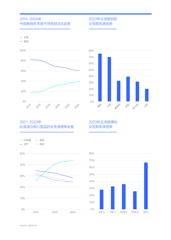 近幾年,積極布局小電動的中國品牌成為女性化趨勢的最大受益者,繽果、海豚、海鷗、好貓等具體產品紛紛爆款,并把POLO、飛度、威馳等海外車企的燃油小車直接拍死在沙灘上。2023年女性為比亞迪貢獻了近45%的銷量,助力比亞迪快速稱雄中國與全球車市。海外車企的女性占比則持續(xù)下滑,2023年日產跌破30%,本田與豐田跌破25%;