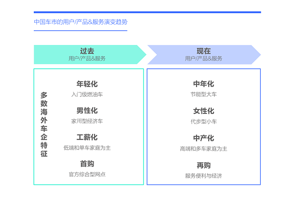 通過前四頁的論證,我們提煉了中國車市用戶演變層面的中年化、女性化、中產化與存量化等幾大新趨勢,并發(fā)現(xiàn)該趨勢正助推中國車市的節(jié)能型大車、代步型小車、高端品牌、便利與經濟性服務網(wǎng)點等的發(fā)展。但海外車企的現(xiàn)行理念與布局嚴重滯后于中國購車用戶結構與需求的演變趨勢,其仍心心念念年輕用戶和首購用戶,且客觀存在大男子主義和工薪用戶占比過高等挑戰(zhàn),導致了海外車企的產品與服務仍局限于入門級燃油車、家庭型經濟車、綜合性網(wǎng)點等;