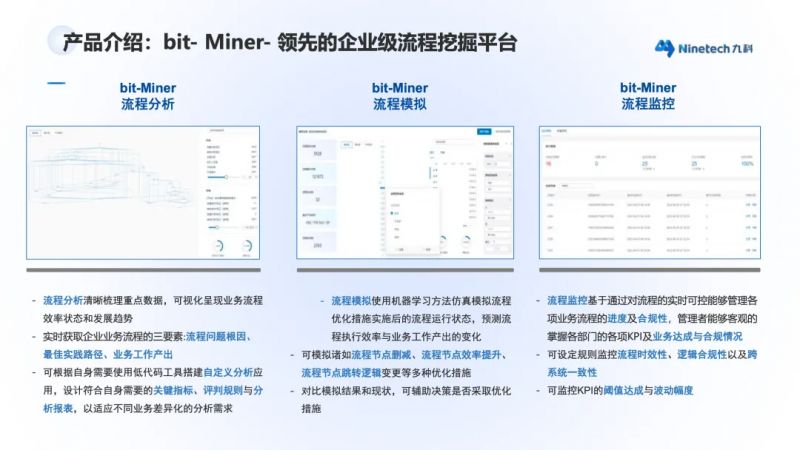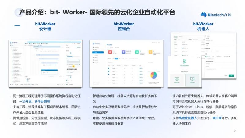 在解決了兼容問題后,九科信息根據RPA+AI、低代碼以及流程挖掘技術分別推出了bit-Worker、bit-Miner以及bit-Builder三個明星產品。