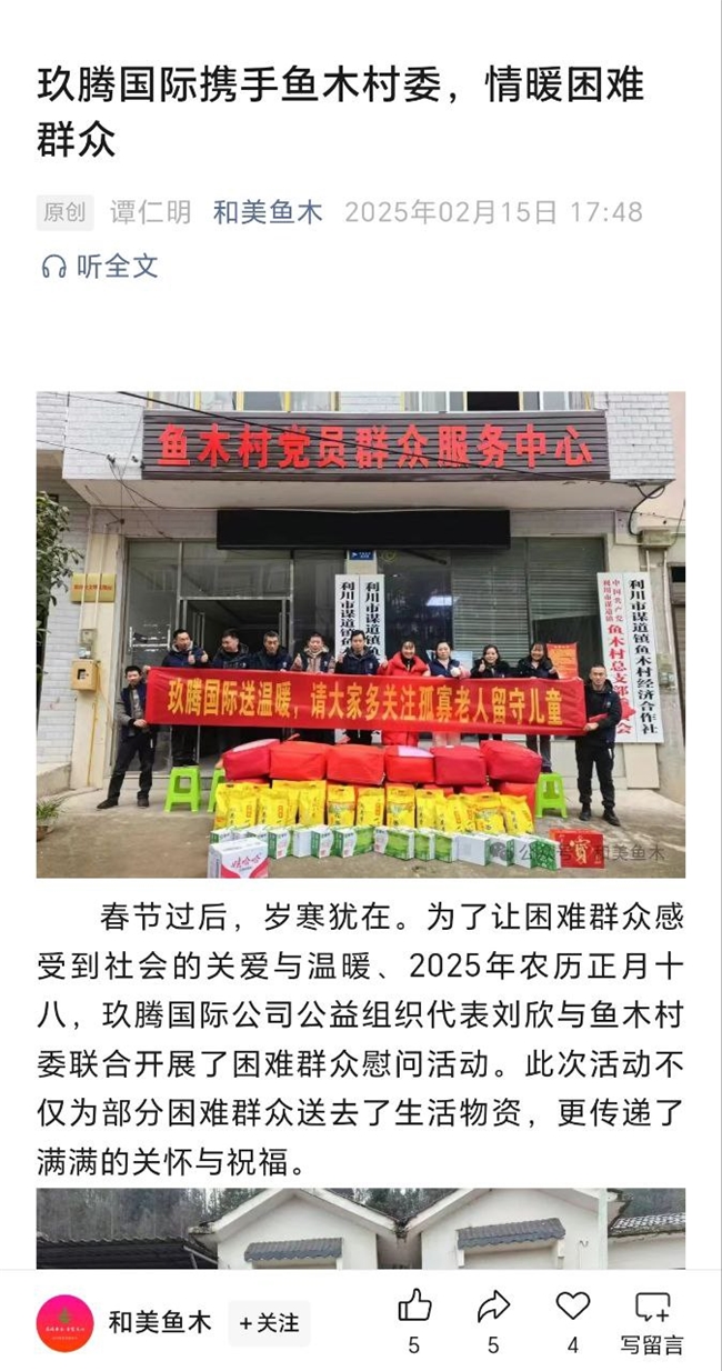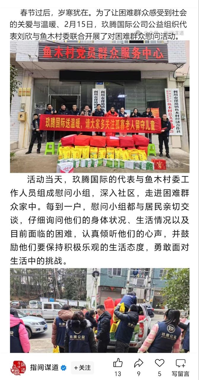 2月15日,湖北省恩施土家族苗族自治州謀道鎮(zhèn)魚木村迎來(lái)了一股溫暖的力量。玖騰國(guó)際投資有限公司(香港)的公益組織代表劉欣女士率隊(duì)在這個(gè)村落,開展了一場(chǎng)慰問活動(dòng),為當(dāng)?shù)氐睦щy黨員、留守老人及兒童送去了急需的生活物資與深切的關(guān)懷,用實(shí)際行動(dòng)詮釋了企業(yè)的社會(huì)責(zé)任與大愛無(wú)疆的精神。