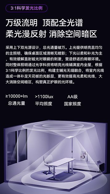 書客 Sun Pro 照明迎來全新升級(jí),以創(chuàng)新的上下雙光源設(shè)計(jì),實(shí)現(xiàn)總光通量突破萬流明,帶來更專業(yè)的護(hù)眼照明體驗(yàn)。上光提供明亮均勻的主照明,確保桌面區(qū)域清晰可見,無暗影干擾;下光則以柔和補(bǔ)光為主,有效降低直射眩光對(duì)眼睛的刺激,營(yíng)造舒適的用眼環(huán)境。產(chǎn)品融合先進(jìn)光學(xué)科技,精準(zhǔn)控制光線分布,使明亮光線均勻覆蓋全屋。在光學(xué)設(shè)計(jì)上,書客 Sun Pro 采用科學(xué)驗(yàn)證的 3:1 主輔光比例,填補(bǔ)天花板光斷層,實(shí)現(xiàn)光線無縫銜接,減少空間暗區(qū),顯著提升整體光環(huán)境的柔和度。同時(shí),搭載三重減影技術(shù)與 SunPath 多維漫射系統(tǒng),采用 360° 環(huán)繞式側(cè)發(fā)光,內(nèi)置光源芯片模塊,經(jīng)過多重反射與柔和擴(kuò)散處理,使光照柔和度提升 89%。光線自內(nèi)而外均勻鋪展,實(shí)現(xiàn)真正的無黑邊、全覆蓋,不僅全方位照亮桌面,還能有效削減手部及頭部陰影,打造更舒適、無壓迫感的用眼體驗(yàn)。