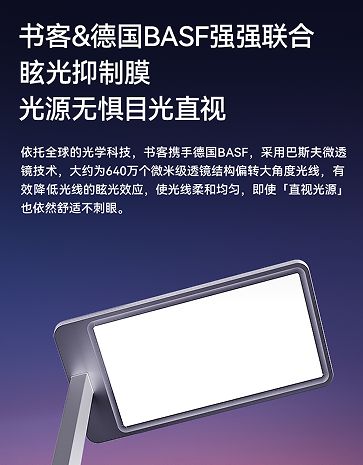 書客 Sun Pro 落地大臺(tái)燈全面升級(jí)至全光域防眩光技術(shù) 4.0,攜手德國(guó) BASF,依托全球領(lǐng)先的光學(xué)科技,打造更專業(yè)的護(hù)眼照明體驗(yàn)。創(chuàng)新運(yùn)用巴斯夫微透鏡技術(shù),在光源表面精密構(gòu)造約 640 萬個(gè)微米級(jí)透鏡結(jié)構(gòu),精準(zhǔn)偏轉(zhuǎn)大角度光線,使無數(shù)細(xì)膩光流匯聚為均勻柔和的光束。防眩效果提升約 20%,UGR ≤ 10.1,刷新防眩新高度,有效降低光線眩光效應(yīng),即使直視光源,依然舒適不刺眼,為眼睛提供更健康的光環(huán)境。此外,書客 Sun Pro 采用三重減影結(jié)合 SunPath 多維漫射技術(shù),通過 360° 環(huán)繞式側(cè)發(fā)光,使光線更加均勻自然。同時(shí),搭載接近自然光的平衡色譜和特制防眩光涂層,在保持高亮度的同時(shí),有效減少眩光對(duì)眼睛的刺激,營(yíng)造舒適、護(hù)眼的理想照明體驗(yàn)。
