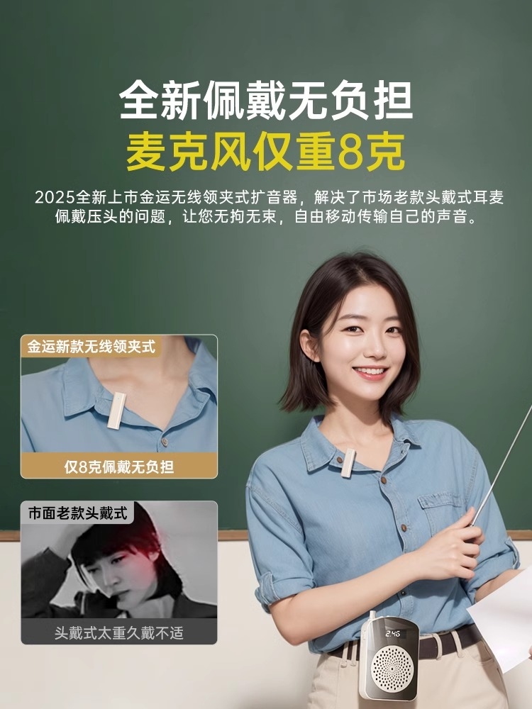 傳統(tǒng)頭戴式擴(kuò)音器因重量大、久戴壓迫頭部等問題飽受詬病。金運(yùn)M10擴(kuò)音器創(chuàng)新采用領(lǐng)夾式無線結(jié)構(gòu),機(jī)身僅重8克(約一枚硬幣重量),搭配隱形背夾設(shè)計(jì),可靈活固定于衣領(lǐng)、口袋或背包帶,徹底擺脫頭戴設(shè)備的沉重感。無論是教師全天授課、導(dǎo)游長時(shí)間講解,還是直播達(dá)人多場景切換,M10均能實(shí)現(xiàn)“無感佩戴”,讓聲音傳遞更自由。
