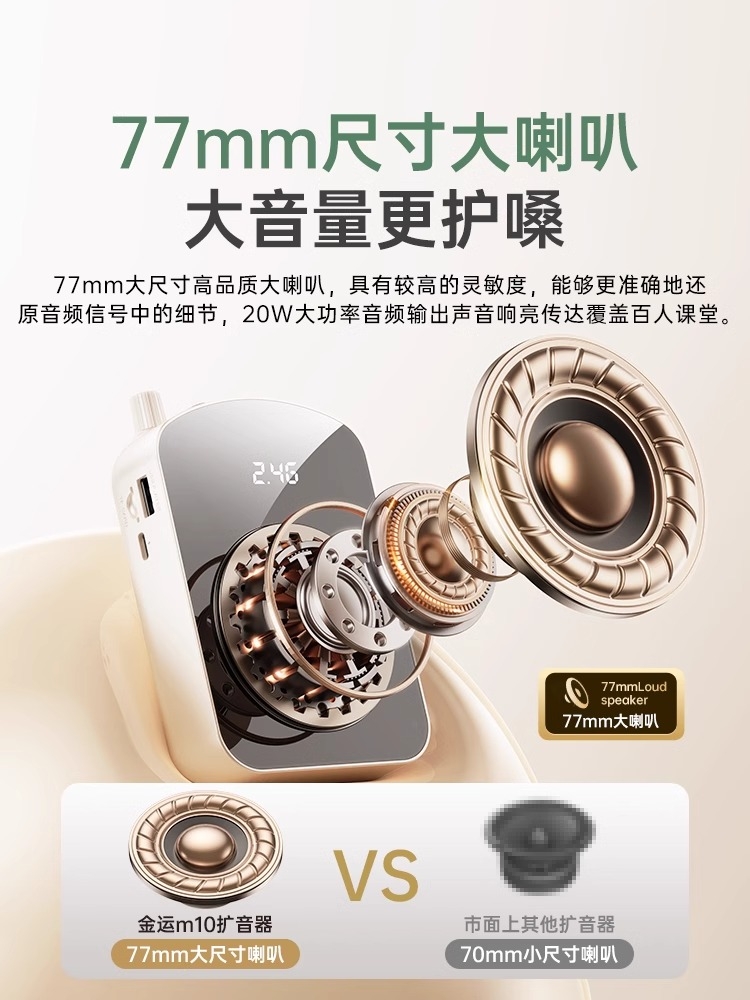 金運(yùn)M10擴(kuò)音器打破“小體積=小音量”的行業(yè)局限,創(chuàng)新搭載20W超大功率(市面同類的3倍)與77mm定制喇叭,聲壓級(jí)高達(dá)110dB,實(shí)測可覆蓋300人教室/40米范圍,確保后排聽眾清晰接收內(nèi)容。其聲學(xué)結(jié)構(gòu)經(jīng)金運(yùn)實(shí)驗(yàn)室上百次調(diào)校,既能實(shí)現(xiàn)震撼音量,又避免破音失真,長時(shí)間使用不傷嗓,堪稱教師、培訓(xùn)師的“護(hù)嗓剛需”。