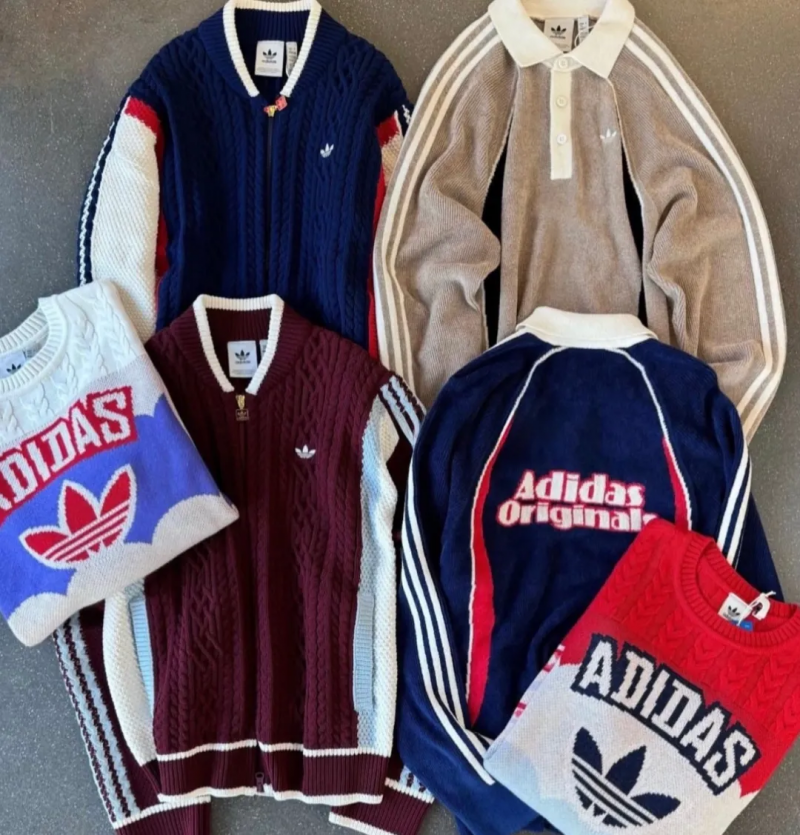 阿迪達斯品牌檔案庫中經(jīng)典的adidas外套產(chǎn)品被打造為針織版本,再加上受切爾西經(jīng)典球衣啟發(fā)的足球針織、復(fù)古圖案提花毛衣等產(chǎn)品,形成強勢的運動針織細(xì)分品類,為阿迪達斯運動服的時尚競爭力打開了新的發(fā)揮空間。