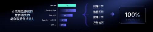 同時,商湯小浣熊始終保持世界領先的復雜數(shù)據(jù)分析能力。在客戶場景的綜合測試中,小浣熊達到在數(shù)據(jù)分析和智能體領域的國際標桿 Claude 4 Opus 的水平,大幅領先OpenAI o3等模型。其中,在時序計算、數(shù)據(jù)匹配、數(shù)理計算和異常檢測等任務中,準確率均可接近 100%。