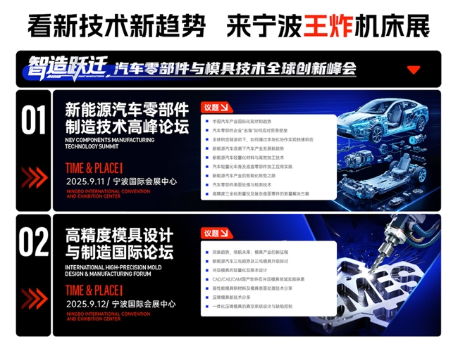 展會(huì)同期舉辦“智造躍遷·汽車零部件與模具技術(shù)全球創(chuàng)新峰會(huì)”,聚焦汽車零部件、模具制造核心主題,邀請(qǐng)中國(guó)汽車工業(yè)協(xié)會(huì)、博格華納、吉利汽車研究院、寧波市模具行業(yè)協(xié)會(huì)、寧波市機(jī)床設(shè)備行業(yè)協(xié)會(huì)、浙江省模具行業(yè)協(xié)會(huì)、天正模具、力勁科技等30+協(xié)會(huì)代表、技術(shù)專家、企業(yè)高管等同臺(tái)論道,直擊汽車零部件全球化破局與模具精度0.01mm極限突破。