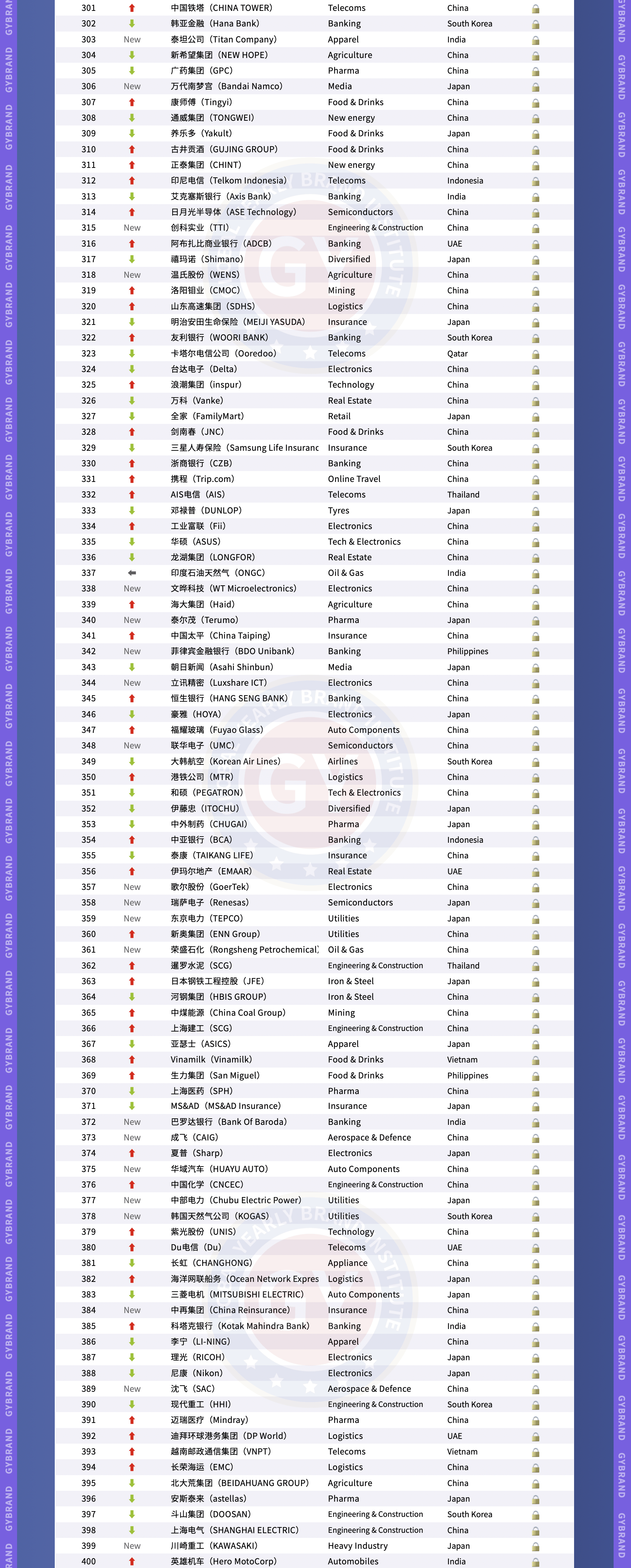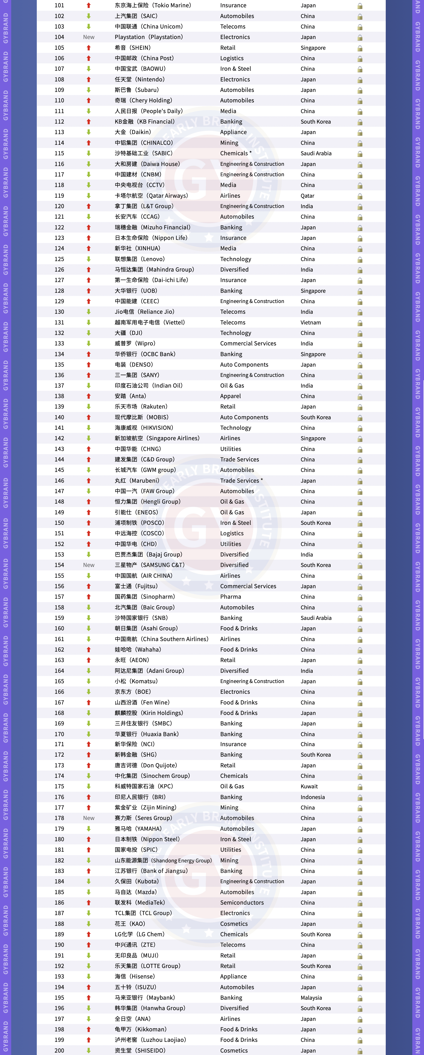 在GYBrand首席分析師金良鑫表示:“當(dāng)今世界百年未有之大變局加速演進(jìn),中國(guó)企業(yè)在科技創(chuàng)新前沿領(lǐng)域取得了一系列突破性成果,并加快推進(jìn)新型工業(yè)化,培育壯大先進(jìn)制造業(yè)集群,推動(dòng)制造業(yè)高端化、智能化、綠色化發(fā)展。而在戰(zhàn)略性新興產(chǎn)業(yè)領(lǐng)域正處于搶占制高點(diǎn)、向更高位躍升的重要關(guān)口,引領(lǐng)著全球科技革命和產(chǎn)業(yè)變革的方向,新一代信息技術(shù)、半導(dǎo)體、新能源、新材料、高端裝備發(fā)展?jié)摿薮螅磥?lái)或有更多中國(guó)企業(yè)躋身GYBrand亞洲品牌價(jià)值500強(qiáng)榜單。”