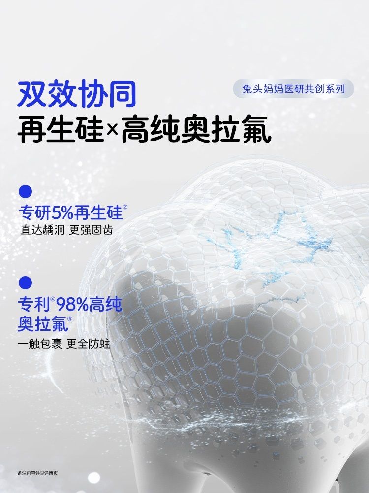 目前像上海九院、國(guó)內(nèi)高校研究所都認(rèn)可早期齲再礦化治療、牙釉質(zhì)磨損修復(fù)等,即讓已經(jīng)脫礦的牙釉質(zhì)重新生長(zhǎng)礦物,再次礦化,恢復(fù)牙齒的硬度和結(jié)構(gòu),從而終止或消除早期齲損。在同一治療思路下,兒童口腔健康護(hù)理品牌兔頭媽媽上新護(hù)牙素2.0,在具有修護(hù)功效的生物性原料上取得突破,升級(jí)為再生硅成分,相較于上一代生物活性玻璃成分,修護(hù)牙釉質(zhì)更快、更多、更硬、更牢。