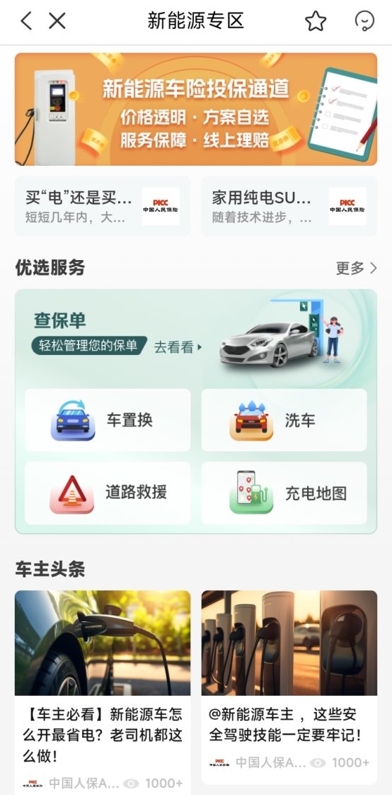 中國(guó)人保則是在官方平臺(tái)“中國(guó)人保APP”開設(shè)了“新能源專區(qū)”,以車主高頻需求為核心,集成在線投保、查保理賠、充電地圖、道路救援、車輛洗護(hù)、行業(yè)資訊、車輛置換等多個(gè)服務(wù)模塊,形成覆蓋新能源車主用車全周期的服務(wù)閉關(guān)。且該專區(qū)通過優(yōu)化服務(wù)鏈條與功能集成,進(jìn)一步貼合新能源用戶的使用習(xí)慣。