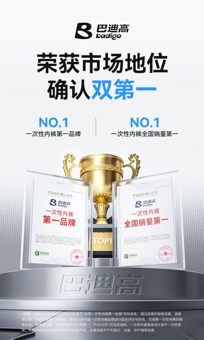 近日,巴迪高榮獲全球領(lǐng)先的新經(jīng)濟產(chǎn)業(yè)第三方數(shù)據(jù)挖掘和分析機構(gòu)iiMedia Research(艾媒咨詢)授予的“一次性內(nèi)褲第一品牌”“一次性內(nèi)褲全國銷量第一”雙項市場地位確認。