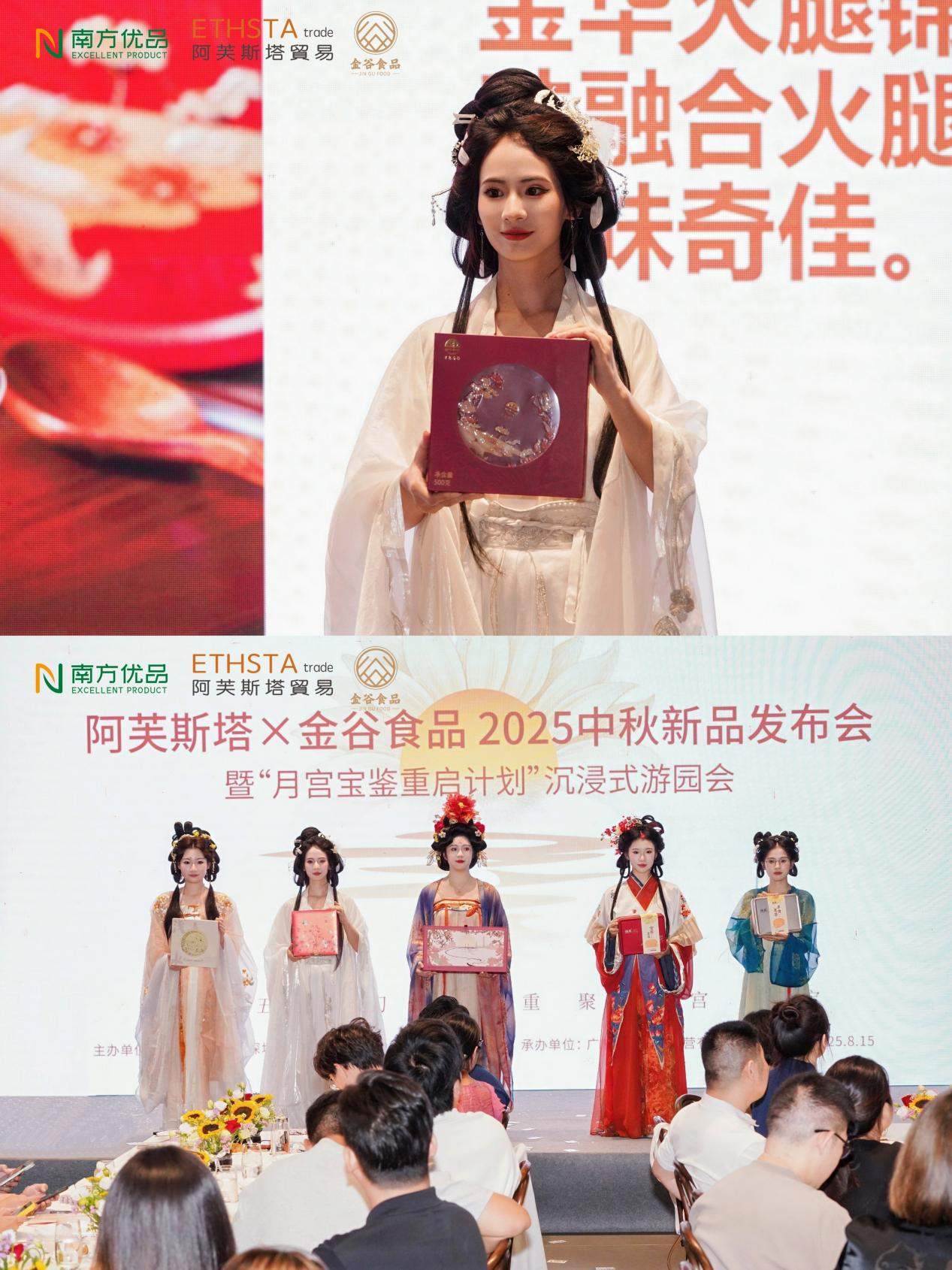 緊隨其后的創(chuàng)意產(chǎn)品走秀,專業(yè)模特化身月宮仙娥,手持匠心之作,全景式呈現(xiàn)阿芙斯塔×金谷食品2025全系列中秋新品。每一款都承載著“月餅之鄉(xiāng)”吳川千百年來的匠人智慧與地域文化故事,彰顯了阿芙斯塔與金谷食品品牌歷久彌新的匠心傳承與銳意創(chuàng)新的時代活力。