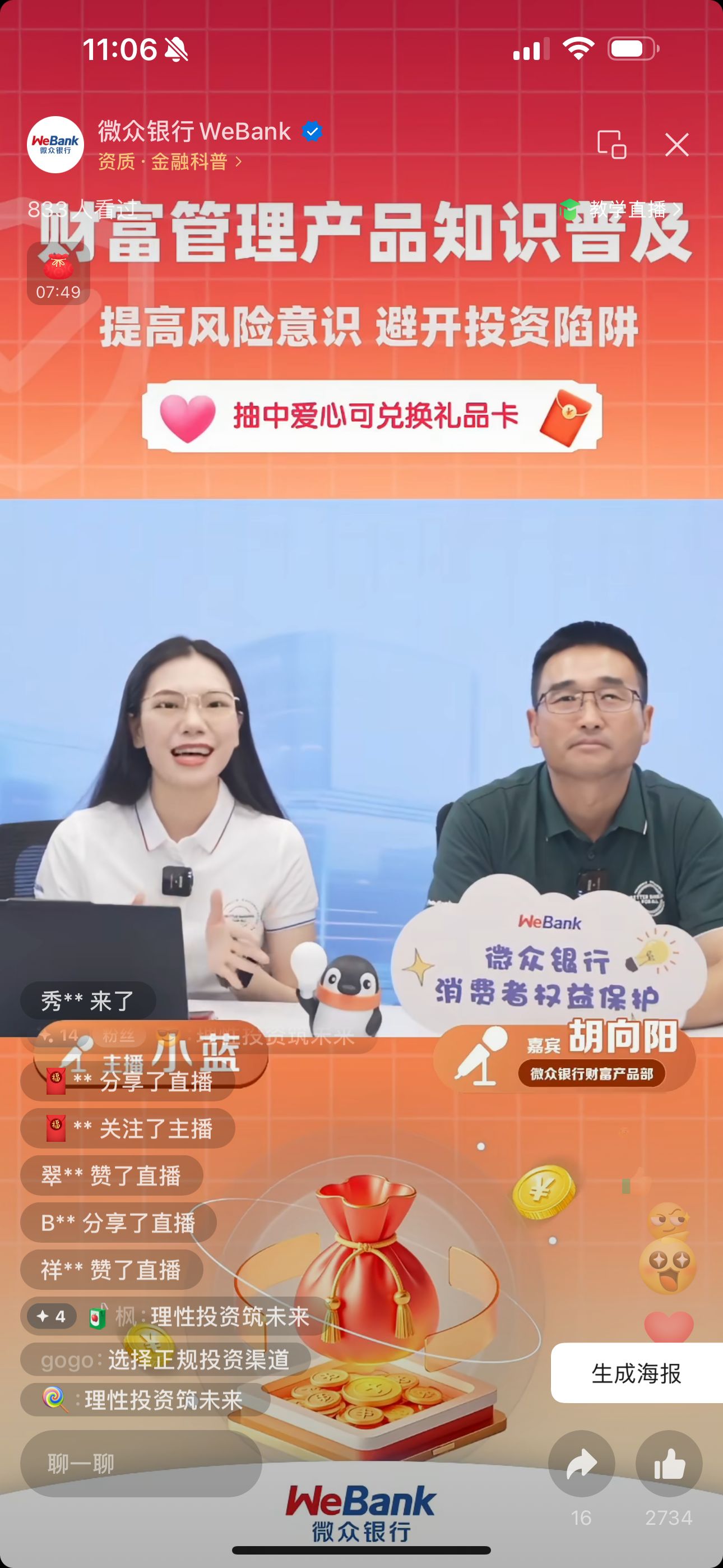 微眾銀行本次“財(cái)富管理產(chǎn)品知識(shí)普及”專場(chǎng)直播活動(dòng)共吸引超63萬人次在線觀看,收獲觀眾點(diǎn)贊近26萬次,評(píng)論超2900條,普及的金融投資知識(shí)廣獲好評(píng)。
