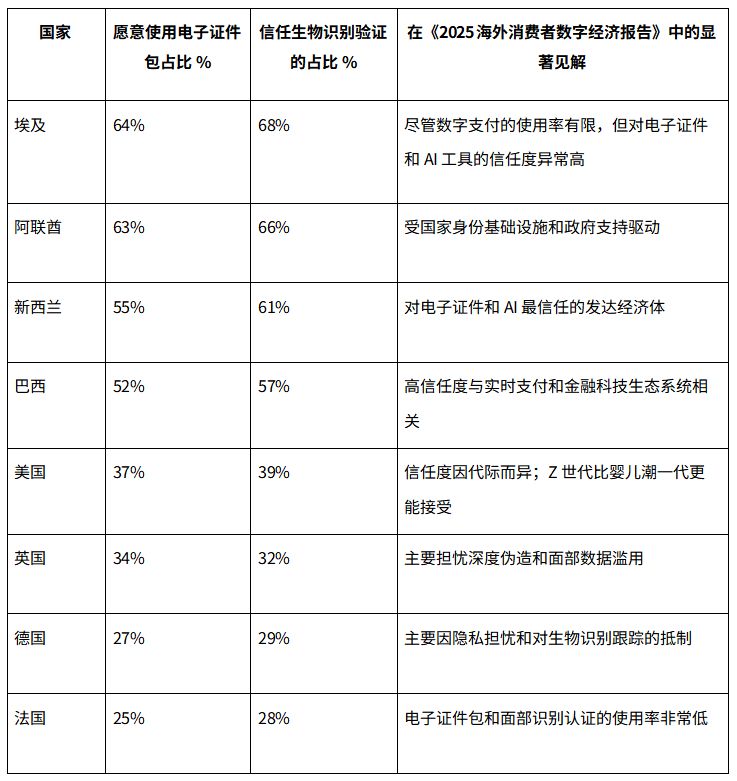 Checkout.com 在上半年發(fā)布的《2025海外消費者數(shù)字經(jīng)濟(jì)報告》對 16 個國家的 18,000 名消費者進(jìn)行了全球調(diào)查,揭示了全球消費者對數(shù)字身份解決方案的看法和采用信任度的明顯差距。雖然電子證件已成為數(shù)字經(jīng)濟(jì)的基礎(chǔ)層,但研究表明,因文化規(guī)范、監(jiān)管環(huán)境和新興技術(shù)接觸度的多方影響,不同地區(qū)對接受數(shù)字化技術(shù)態(tài)度存在顯著差異。同時,AI 電商代理(由 AI 驅(qū)動,可代表消費者完成購物行為的工具)的興起,更加突顯了身份驗證在交易中的重要性。