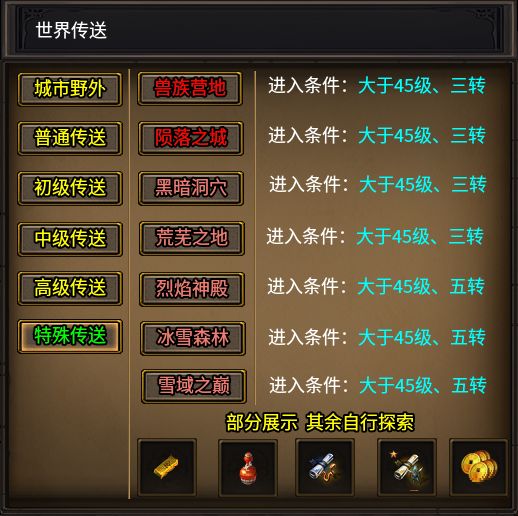 全服延續(xù)了完整的1.80復(fù)古玩法的世界架構(gòu),相對(duì)簡(jiǎn)單,沒有復(fù)雜的多大陸設(shè)計(jì)。只要前往“比奇城”世界傳送陣處,即可隨意前往任意地圖,當(dāng)天進(jìn)入也是有條件的,不同難度的副本地圖需達(dá)成對(duì)應(yīng)的等級(jí)、轉(zhuǎn)生條件。