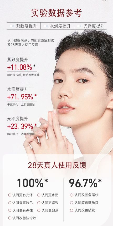 實驗數(shù)據(jù)與用戶反饋進一步驗證了產(chǎn)品實力:內(nèi)部實驗室測試顯示,使用后肌膚緊致度即時提升11.08%、水潤度提升71.95%、光澤度提升23.39%;28天真人使用后,超九成用戶認同肌膚“更水潤”“更有光澤”,對皺紋改善、彈性提升、緊致度增強等效果的認可度也居高不下。這些效果均有專業(yè)檢測報告支撐,其中緊致抗皺、美白、舒緩功效分別源自指定檢測報告,讓消費者使用更安心。