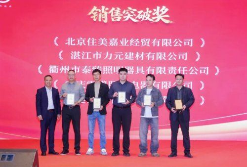 ▲12月12日,“萬家燈火新征程”雷士照明五金渠道大商經(jīng)銷商大會召開。湛江力元建材獲頒“銷售突破獎”,運營總監(jiān)謝宏亮(右二)作為代表上臺領(lǐng)獎。