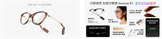 同期發(fā)布的“閃極 loomos AI顯示眼鏡 S1” (以下簡稱:閃極 S1)搭載“鳳凰架構(gòu)2.0”重新定義“全天主動AI眼鏡”,通過鈦合金超薄柔性鏡腿實現(xiàn)可調(diào)曲度及輕量化。同時,閃極聯(lián)合光峰科技“蜻蜓光擎實現(xiàn)”雙眼異步顯示與真3D。產(chǎn)品聚焦“主動AI提醒”,搭載全球首發(fā)硅基芯片級揚聲器,整機(jī)重量29g,體感15g。
