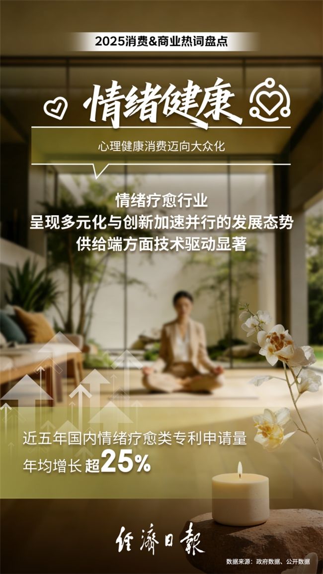 當前情緒療愈行業(yè)呈現(xiàn)多元化與創(chuàng)新加速并行的發(fā)展態(tài)勢,供給端方面技術驅(qū)動顯著,近五年國內(nèi)情緒療愈類專利申請量年均增長超25%。與此同時,消費端的熱情也迅速升溫,京東上“情緒”相關關鍵詞搜索量同比激增超100倍,反映出公眾主動尋求解決方案的強烈意愿。情緒魚油、解壓玩具、情緒療法書籍等成為熱銷品類。這表明,消費者正從被動承受轉(zhuǎn)向主動干預,情緒健康管理日益融入日常消費決策。