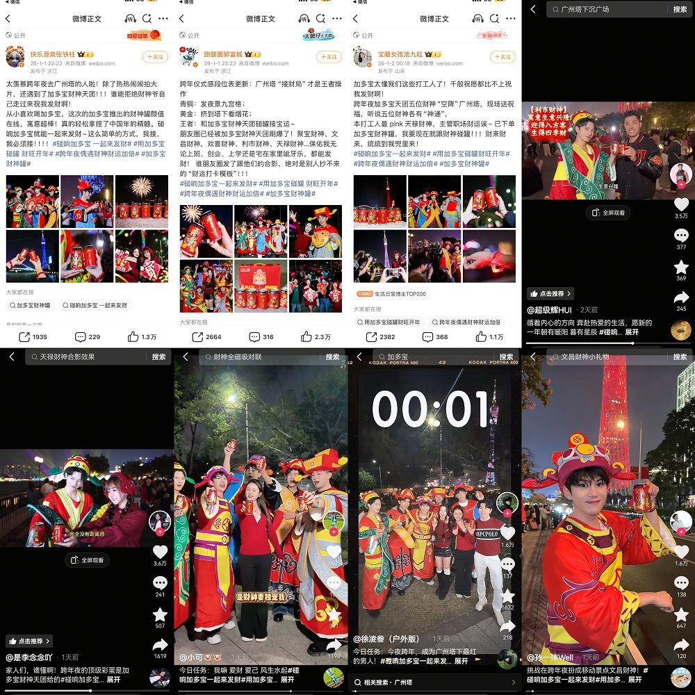 這場(chǎng)線下掃街活動(dòng)從線下蔓延到了線上:活動(dòng)現(xiàn)場(chǎng),路人自發(fā)拍攝短視頻、照片分享至社交平臺(tái),有用戶在文案中寫道“跨年夜被加多寶財(cái)神罐治愈了”“拿著財(cái)神罐跨年,新一年好運(yùn)拉滿”,真實(shí)的體驗(yàn)分享引發(fā)廣泛共鳴。