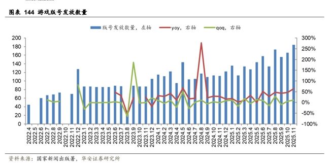 游戲版號(hào)發(fā)放力度提升,保障行業(yè)供給端擴(kuò)容。版號(hào)發(fā)放數(shù)量自 2022 年觸底以來(lái)穩(wěn)步回升,2025年 1-11 月國(guó)產(chǎn)游戲發(fā)放版號(hào)數(shù)為 1532 個(gè),同比增長(zhǎng) 29%。需求側(cè),游戲作為情緒消費(fèi)的重要賽道,市場(chǎng)規(guī)模持續(xù)擴(kuò)容,2025 年中國(guó)游戲市場(chǎng)累計(jì)收入約 3508 億元,同比增長(zhǎng) 8%。