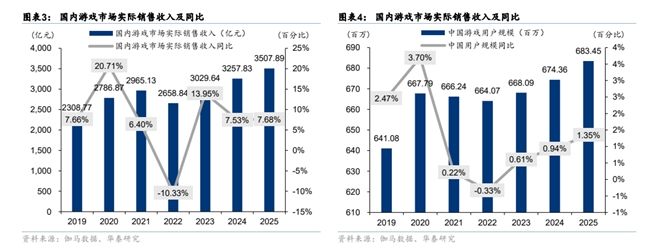 2025年,中國(guó)游戲行業(yè)需求顯著回暖,國(guó)內(nèi)游戲市場(chǎng)實(shí)際銷售收入與用戶規(guī)模雙雙創(chuàng)下歷史新高。驅(qū)動(dòng)因素包括版號(hào)審批常態(tài)化帶來(lái)的穩(wěn)定供給、小程序游戲等多端互通模式有效擴(kuò)張玩家基數(shù),以及AI技術(shù)深度融合帶來(lái)的體驗(yàn)革新。同時(shí),自研游戲海外銷售收入持續(xù)增長(zhǎng),顯示出強(qiáng)大的增長(zhǎng)韌性。行業(yè)正從規(guī)模增長(zhǎng)轉(zhuǎn)向以技術(shù)驅(qū)動(dòng)和文化賦能的高質(zhì)量發(fā)展。根據(jù)游戲工委,2025 年國(guó)內(nèi)游戲市場(chǎng)實(shí)際銷售收入預(yù)計(jì)達(dá)3507.89 億元,同比增長(zhǎng) 7.68%;用戶規(guī)模突破 6.83 億,同比增長(zhǎng) 1.35%,游戲市場(chǎng)規(guī)模增長(zhǎng)主要受益于用戶 ARPU 提升。其中,移動(dòng)游戲?qū)嶄N收入預(yù)計(jì)達(dá) 2570.76 億元,同比增長(zhǎng)7.92%;客戶端游戲強(qiáng)勢(shì)回升,實(shí)銷收入預(yù)計(jì)達(dá) 781.6 億元,同比大幅增長(zhǎng) 14.97%,占比提升至 22.28%,主要受益于頭部長(zhǎng)青產(chǎn)品穩(wěn)定貢獻(xiàn)與多端互通發(fā)行策略。